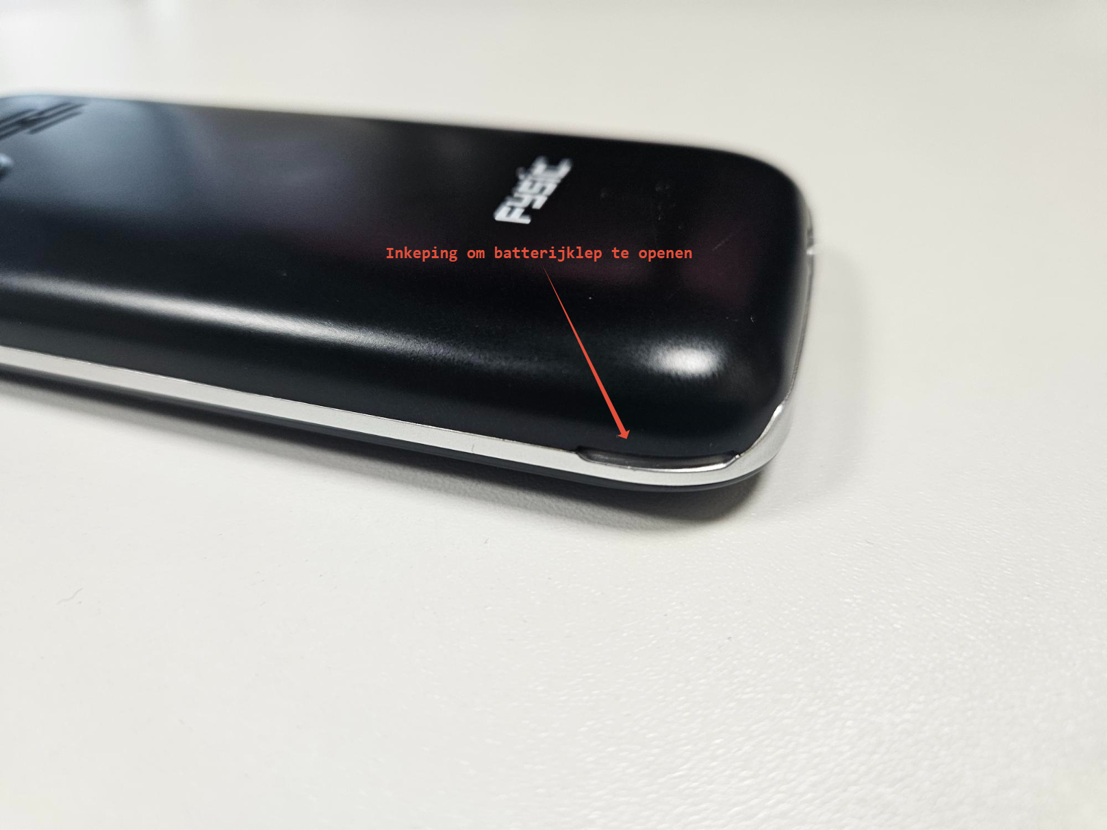 - Verwijder de batterijklep, er zit een inkeping links onderin zoals te zien op de foto.