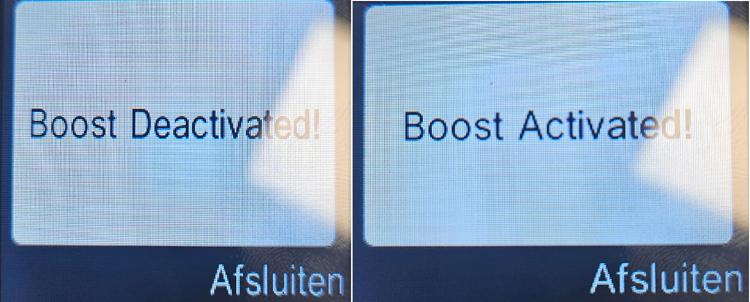 Wanneer er staat "Boost deactivated!" is de functie uitgeschakeld.